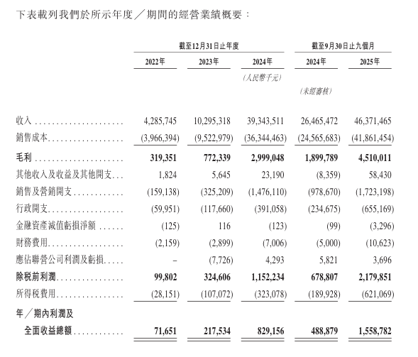 收入呈几何级数增长:公司的收入从2022年的人民币42.86亿元,猛增至2023年的102.95亿元,并在2024年达到393.44亿元。2025年前九个月,收入已达463.71亿元,同比增长75.2%。这一增长部分得益于“赵一鸣”并表,但更主要来源于合并后双品牌协同下的内生扩张。