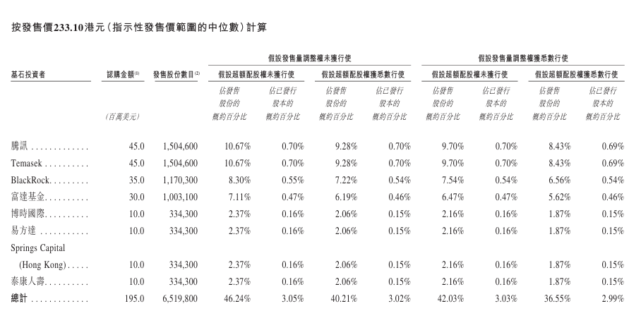 基石投资者阵容堪称“顶配”,根据招股书,共有8家基石投资者参与,合计认购金额高达1.95亿美元,对应约6,519,800股。其中,腾讯(Tencent)与新加坡主权投资基金淡马锡(Temasek)各自认购4500万美元,成为基石阵容中的最大出资方;全球最大资管公司贝莱德(BlackRock)认购3500万美元;富达基金(Fidelity)认购3000万美元。此外,博时国际、易方达(香港)、Springs Capital (Hong Kong)及泰康人寿也分别认购1000万美元。